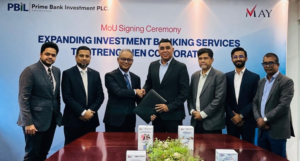 Prime Bank Investment PLC (PBIPLC), a leading and award-winning investment bank in Bangladesh and a subsidiary of Prime Bank PLC, has signed a Memorandum of Understanding (MoU) with MAY International Trade Services Limited (MAYINT), a prominent advisory and consulting firm. The MoU outlines a strategic partnership to source and execute equity, debt, and corporate advisory deals.